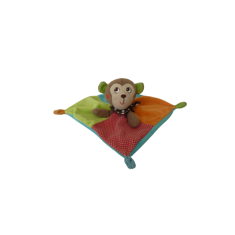 Doudou plat singe 19x19 cm environ, multicolore. Etat : Bon état général pour doudou de secours (écriture sur étiquette effacée)Recipient :