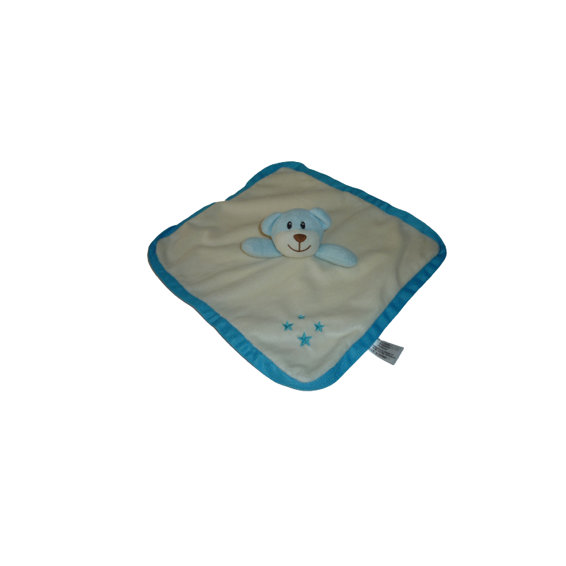 Doudou plat ours 27x27 cm environ, grelot,crème contour turquoise motif étoiles. Etat : Comme neuf