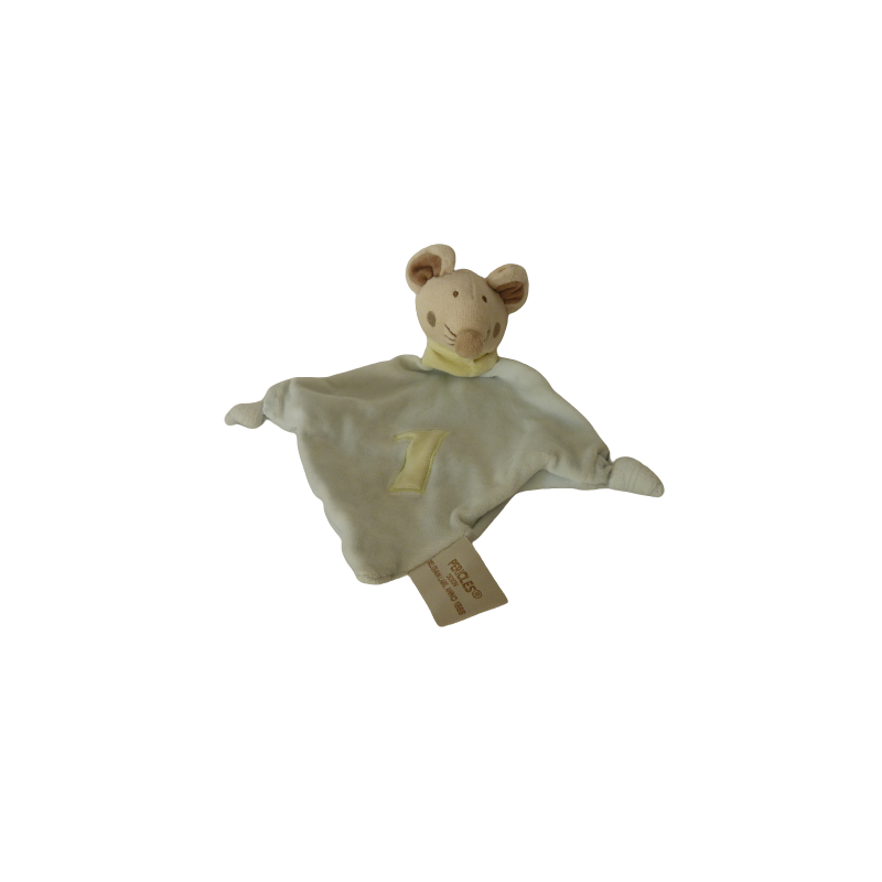 Doudou plat souris 28 cm environ, bleu ciel écharpe verte au cou, chiffre 1 en vert sur le doudou. Etat : Très bon étatRecipient :