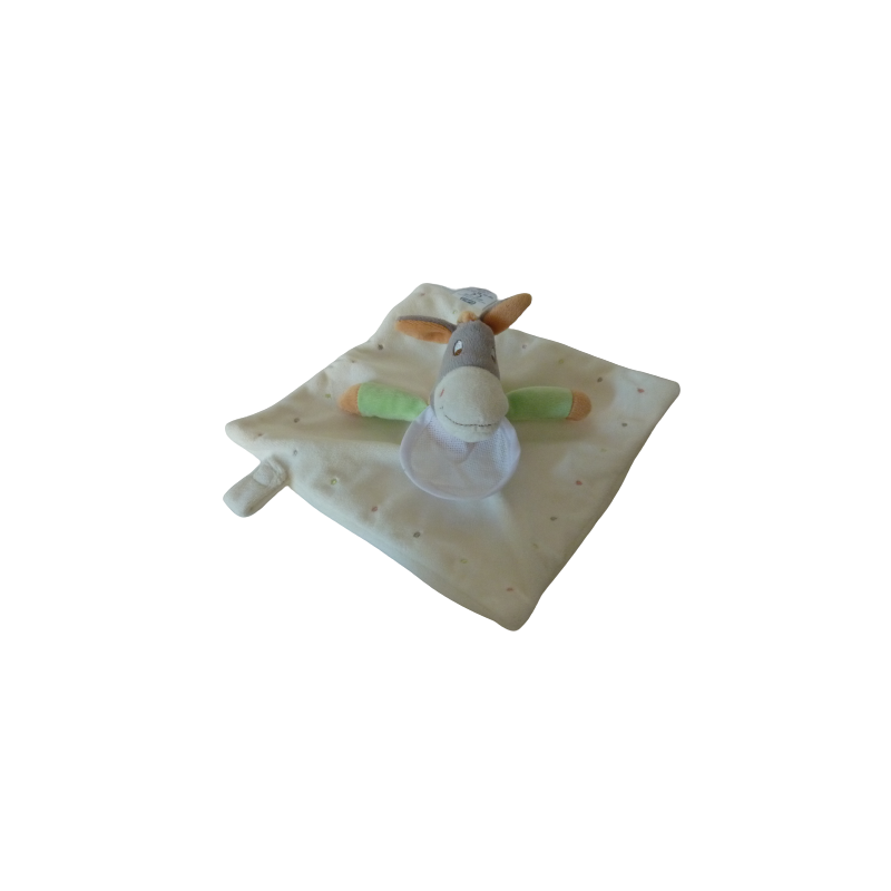 Doudou à broder, plat âne 20x20 cm environ blanc vert orange gris, attache tétine. Etat : Comme neuf