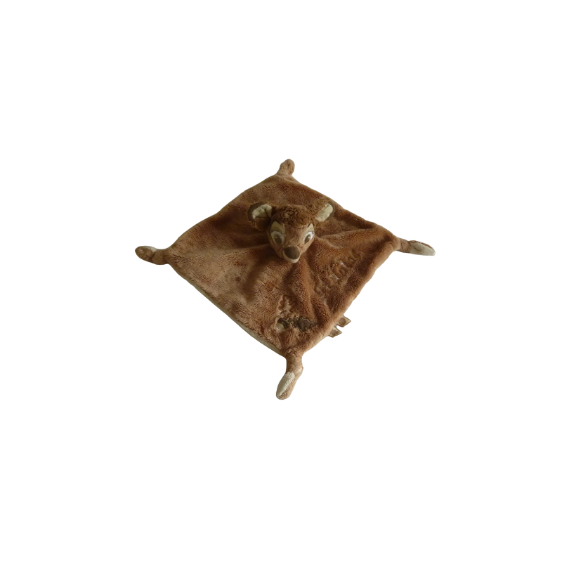 Doudou plat marron Bambi 4 nouages 23x23 cm environ, ATTENTION PRENOM HELOISE BRODE SUR LE DOUDOU. Etat : Comme neuf (étiquette marque coupée)