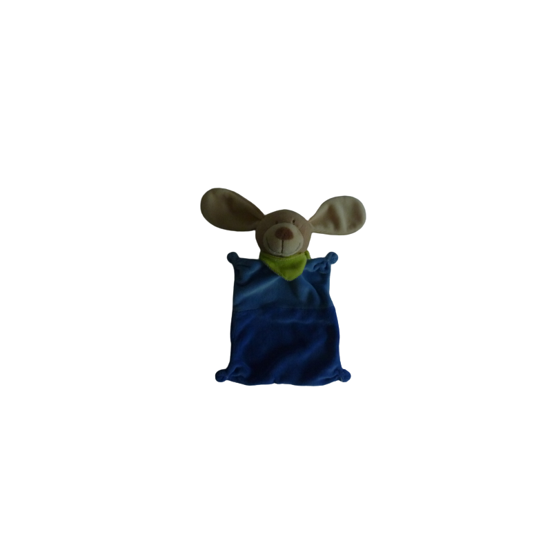 Doudou plat lapin 22 cm environ sans compter les oreilles, bleu écharpe verte. Etat : Comme neuf