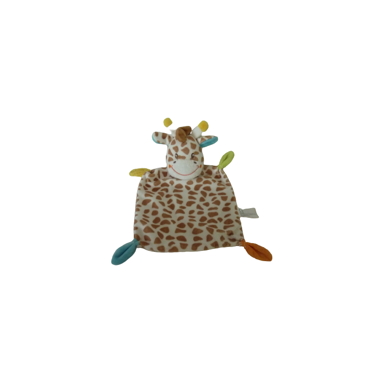 Doudou plat girafe 29 cm environ, blanc marron jaune vert turquoise orange. Etat : Bon état (le doudou est en très bon état mais il y a 2 coins très usés)