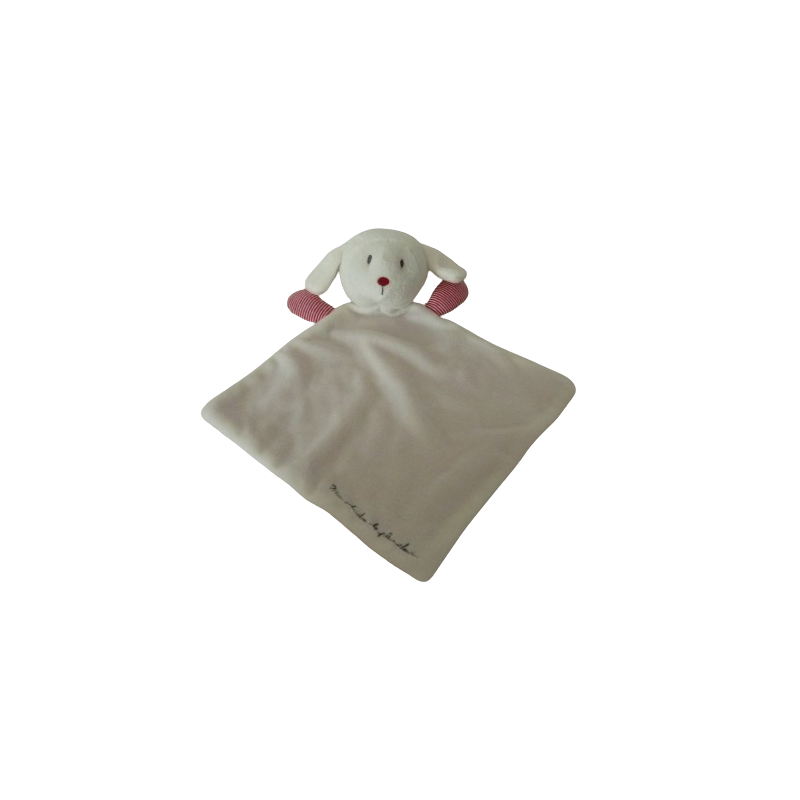 Doudou plat mouton forme losange 30 cm environ, blanc rayure blanc rouge, Mon doudou le plus doux brodé. Etat : Comme neuf (étiquette d'informations coupée)Recipient :