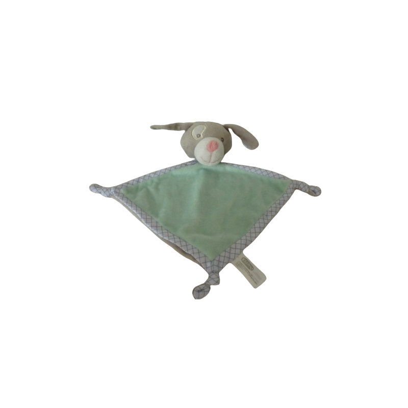 Doudou plat chien forme losange 3 nouages 29 cm environ, vert gris quadrillage, bruissage dans une oreille. Etat : Comme neuf