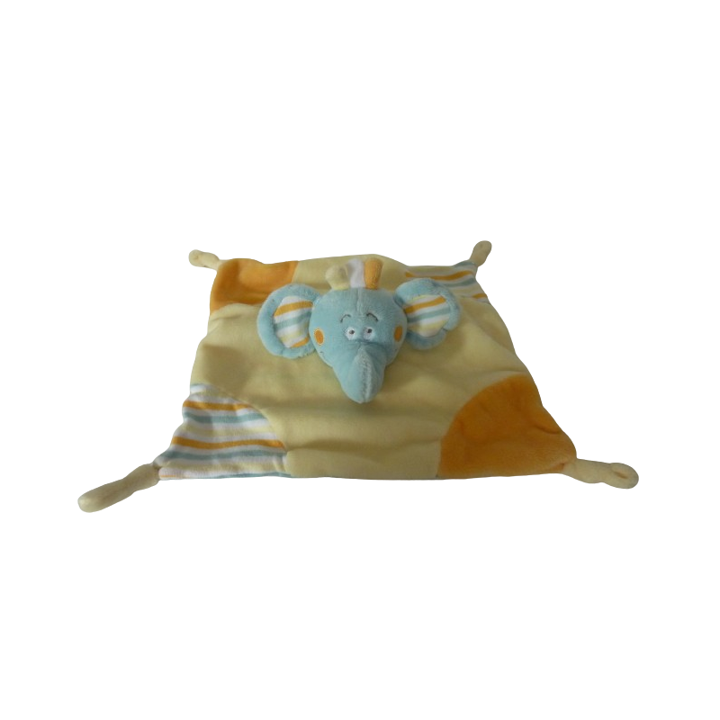 Doudou plat éléphant 26x26 cm environ, 4 nouages, jaune orange rayures. Etat : Comme neuf (étiquette marque coupée)
