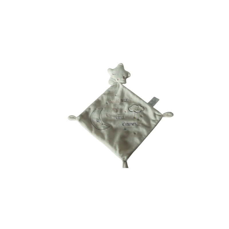 Doudou plat étoile forme losange 35 cm environ, lune nuage, étoiles Sweet night my little dreamer brodés, blanc motif étoiles brillantes. Etat : Comme neuf