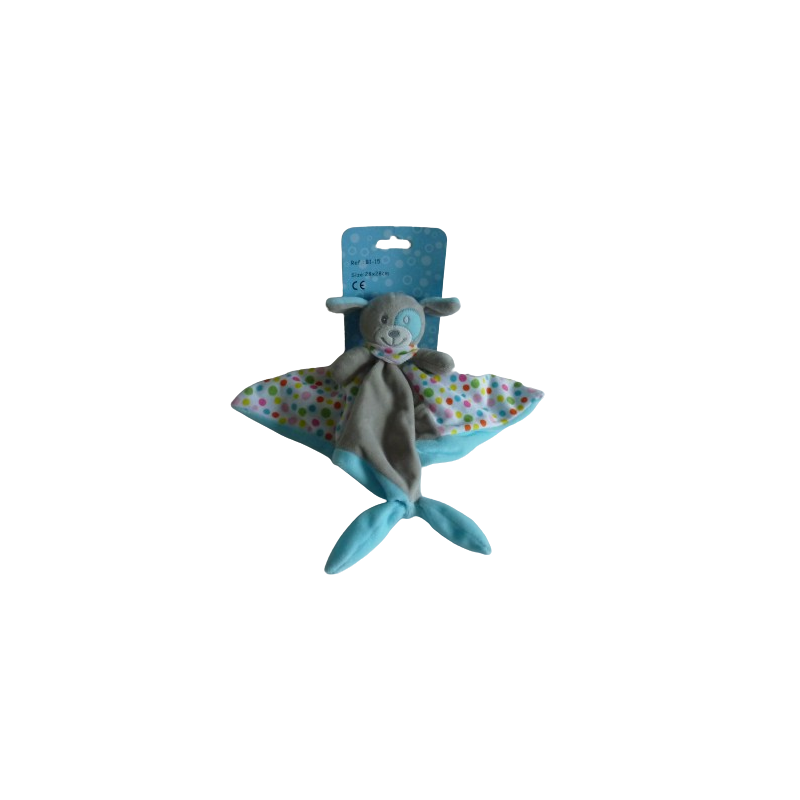 Doudou plat chien 28x28 cm environ, attache tétine, bleu turquoise gris blanc motif ronds. Etat : Neuf