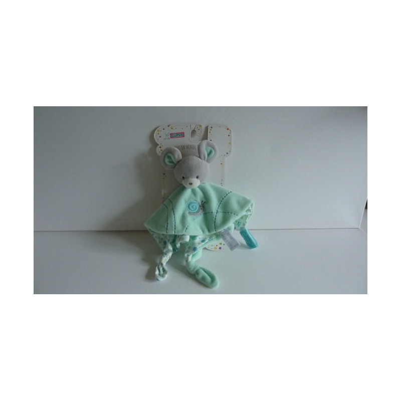Doudou plat souris 29 cm environ de large sans compter les nouages, attache tétine, vert motif escargot, blanc motif feuillage au verso. Etat : NeufRecipient :