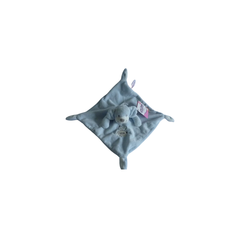 Doudou chien plat 25x25 cm environ, bleu blanc motifs étoiles nuage Sweet Dream brodé. Etat : Neuf