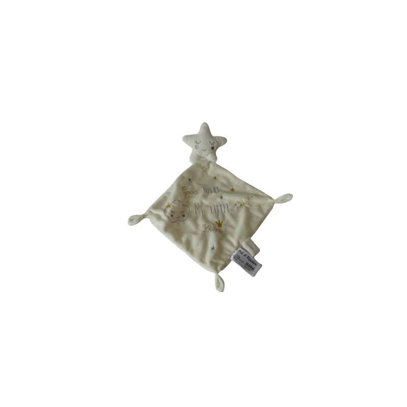 Doudou mouchoir étoile 41 cm environ de longueur, attache tétine, blanc écru motif étoile. Etat : Comme neufRecipient :