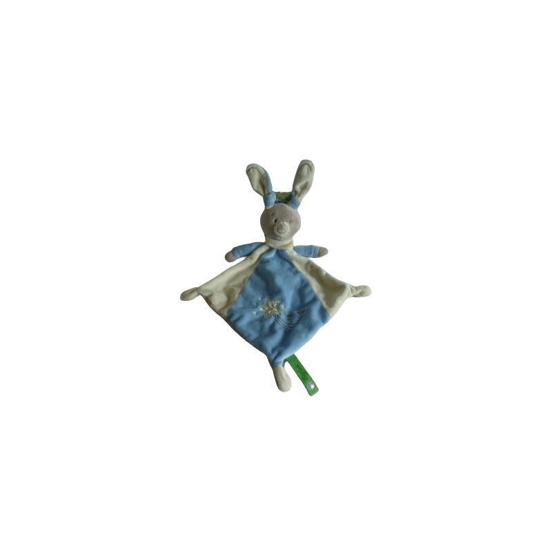 Doudou plat lapin forme losange 38 cm environ sans compter les oreilles, bleu crème taupe motif étoiles Sweet Star brodé. Doudou 100% recycled. Etat : NeufRecipient :
