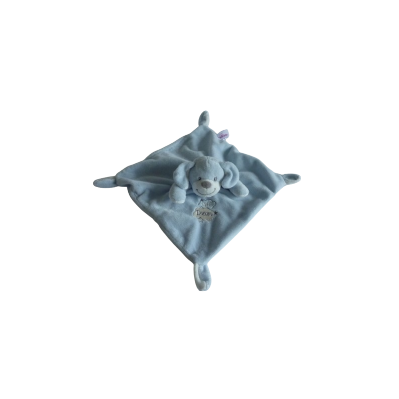 Doudou chien plat 25x25 cm environ, bleu blanc motifs étoiles nuage Sweet Dream brodé. Etat : Comme neuf