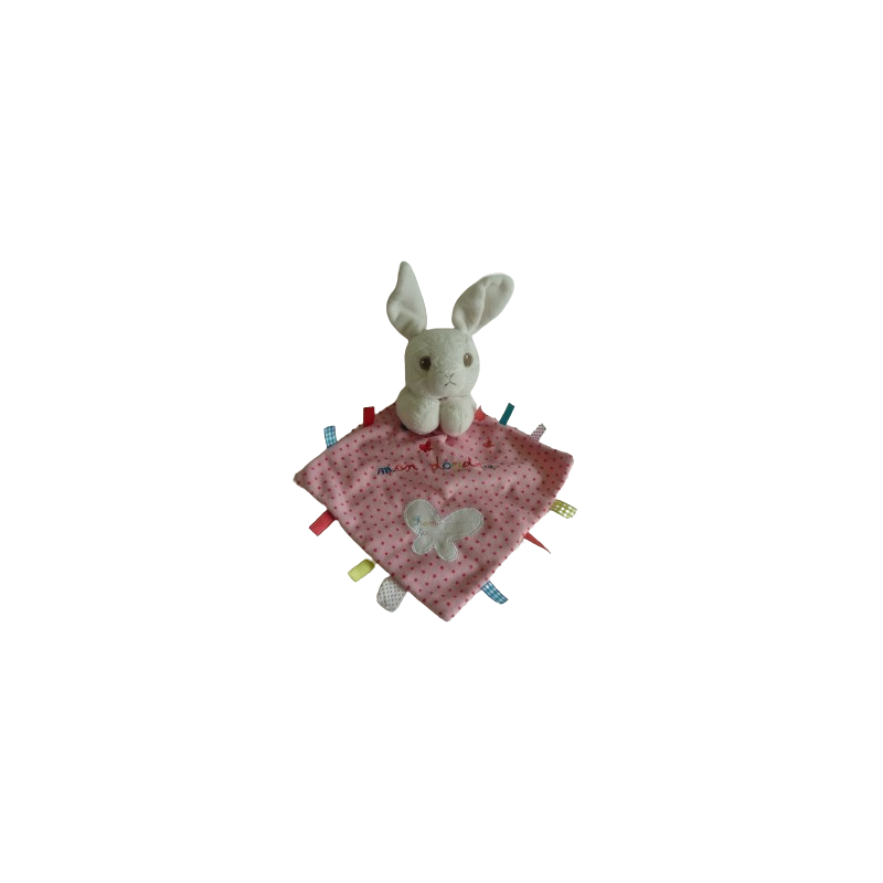 Doudou plat lapin forme losange bordé d'étiquettes 26 cm environ sans compter les oreilles, blanc rose motif pois Mon doudou brodé. Etat : Très bon état (étiquette marque coupée)Recipient :