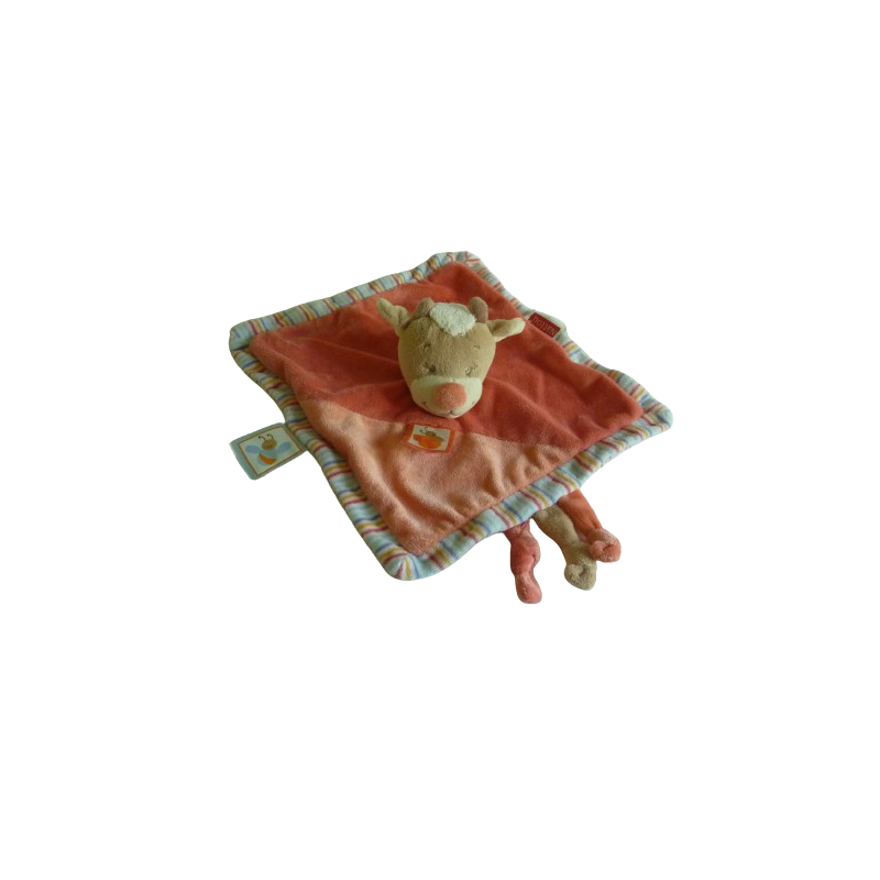Doudou plat vache 26x26 cm environ, rose bord à rayures, 3 nouages. Etat : Comme neufRecipient :
