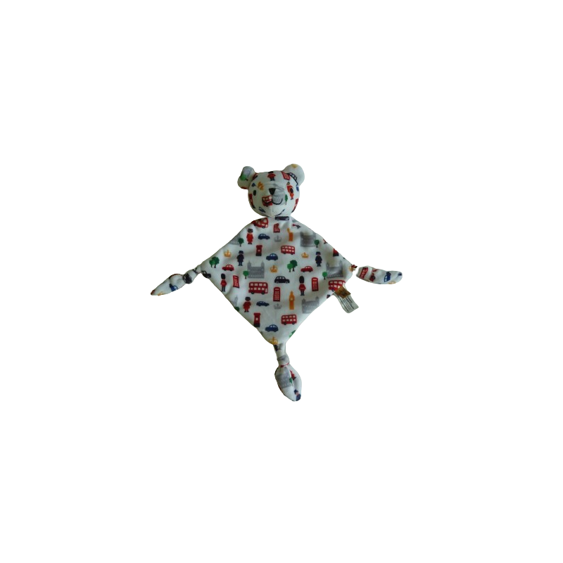 Doudou plat ours forme losange 32 cm environ, 3 nouages, blanc motifs divers Londres. Etat : Comme neuf
