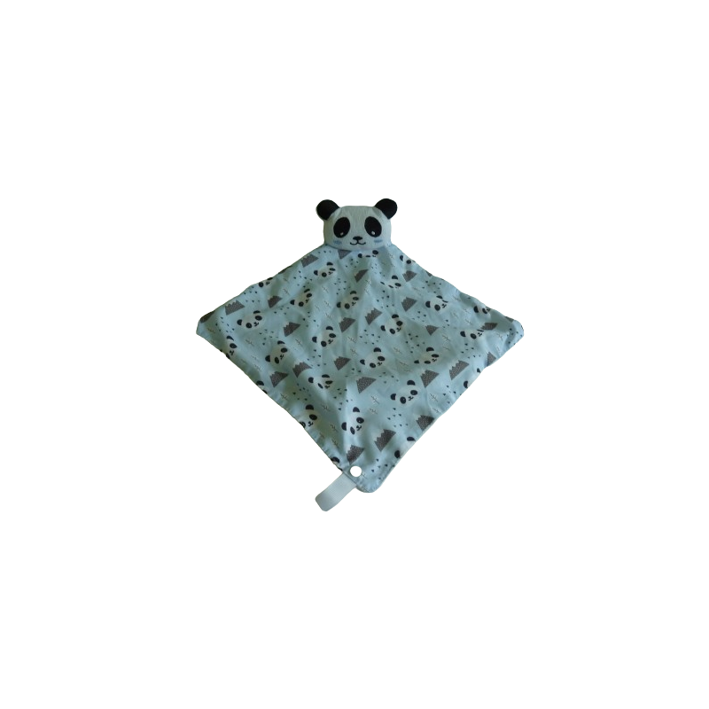 Doudou plat panda forme losange 42 cm environ, attache tétine, blanc bleu motifs. Etat : Comme neuf (étiquette marque coupée)Recipient :