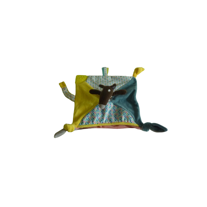Doudou plat loup 25x25 cm environ, attache tétine, anneau dentition, 4 nouages, multicolore. Etat : Comme neufRecipient :