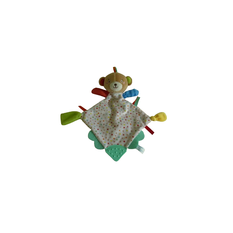 Doudou plat ours forme losange 29 cm environ, multicolore, attache tétine, anneau dentition. Etat : Comme neufRecipient :