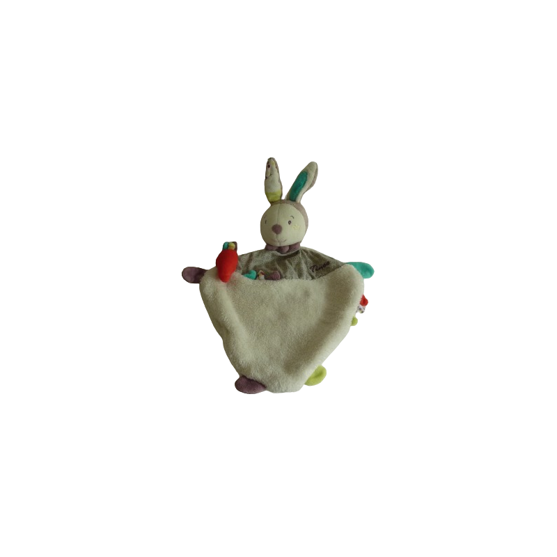 Doudou plat lapin 37 cm environ, grelot, écru motifs. Etat : Comme neuf