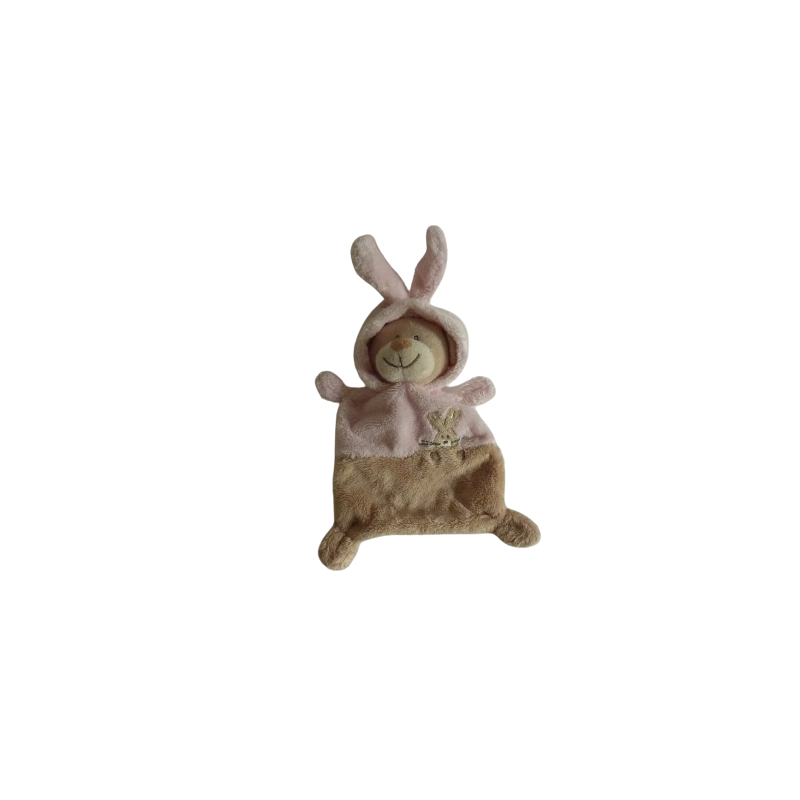 Doudou plat ours 20 cm environ sans compter le bonnet avec les oreilles, marron rose lapin brodé. Etat : Bon état (étiquette informations coupée)Recipient :
