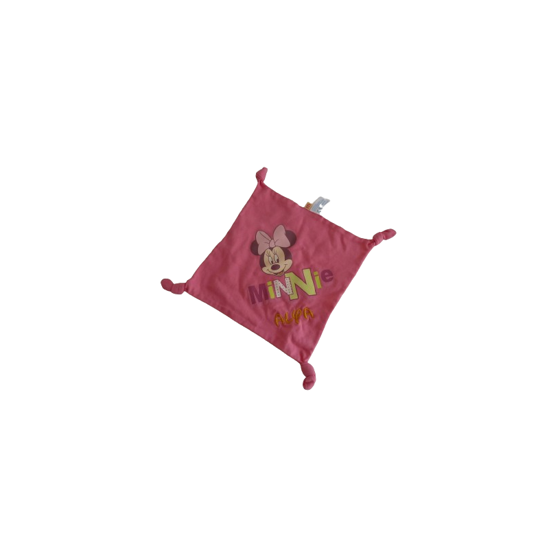 Doudou plat Minnie 20x22 cm environ, 4 nouages, rose motif Minnie. ATTENTION PRENIM DE ALYA BRODE. Etat : Comme neufRecipient :