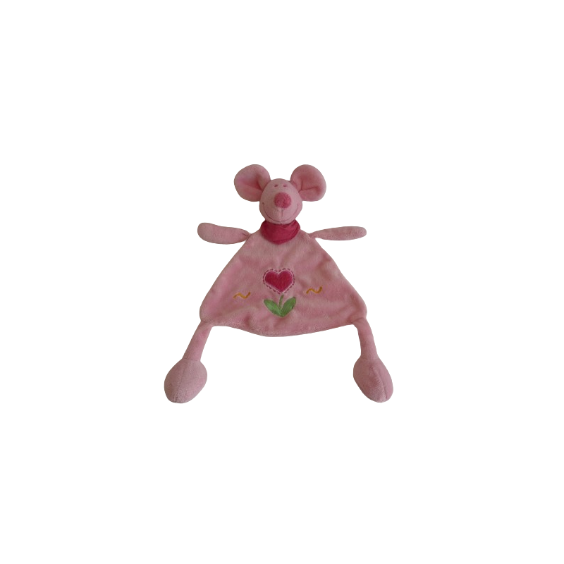 Doudou plat souris 34 cm environ, rose motif fleur coeur. Etat : Parfait état
