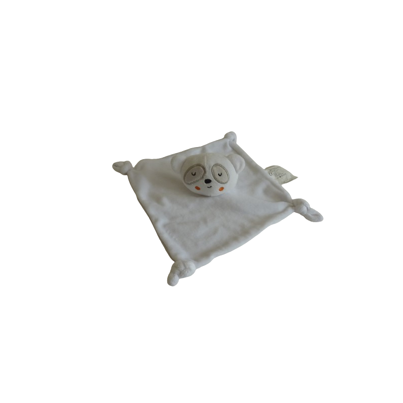 Doudou plat panda 23x23 cm environ, 4 nouages, blanc gris. Etat : Excellent état