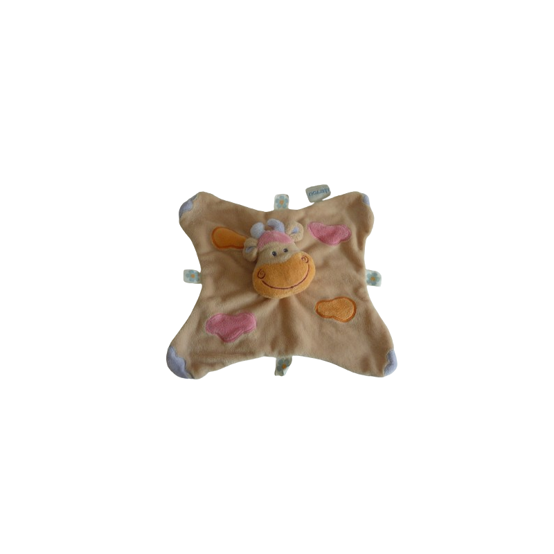 Doudou plat vache 26x26 cm environ, marron beige motif nuages. Etat : Parfait état