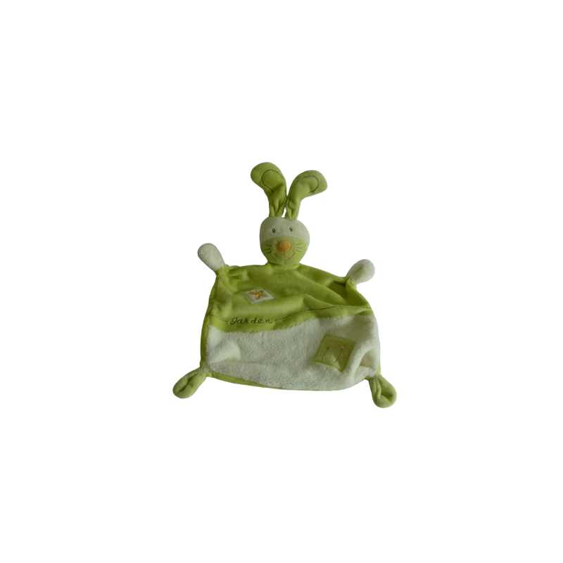 Doudou lapin plat 36 cm environ oreilles comprises, vert blanc motif papillon fleurs Garden brodé. Etat : Comme neufRecipient :