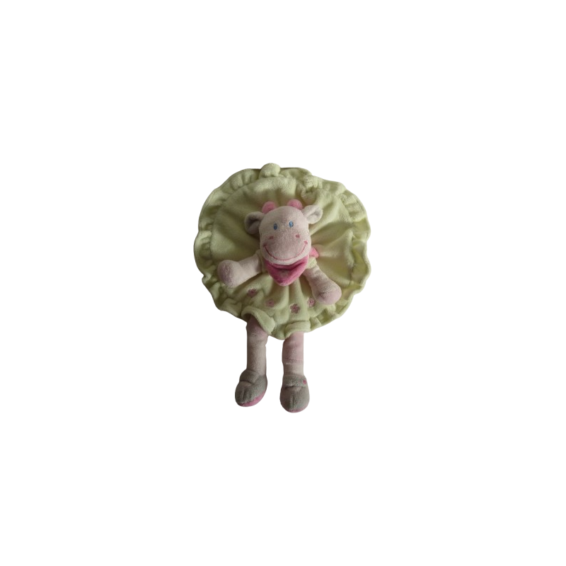 Doudou plat vache 21 cm environ de large, vert rose. Etat : Excellent étatRecipient :