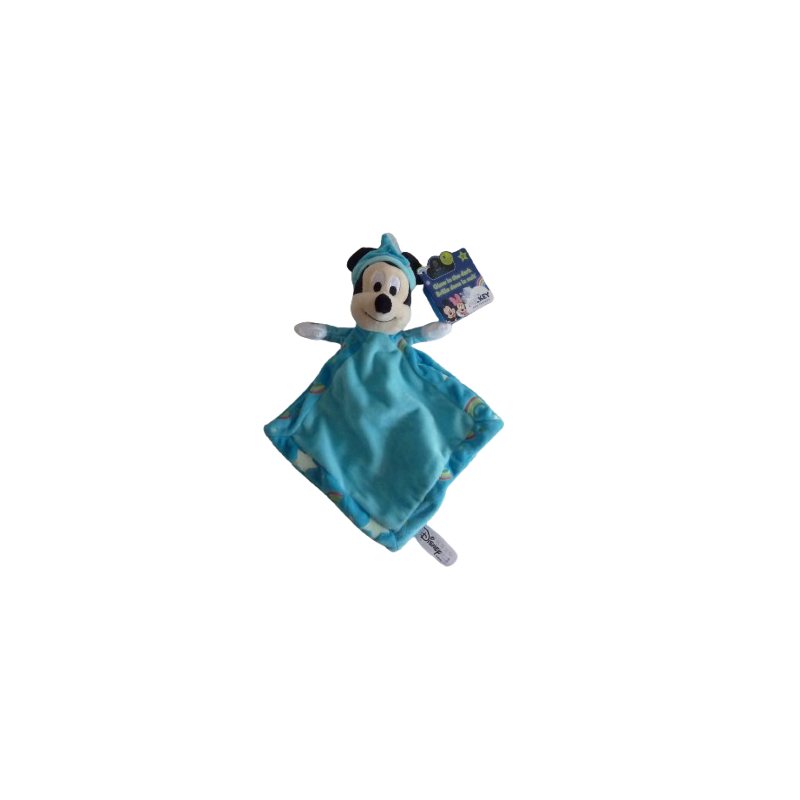 Doudou plat souris Mickey forme losange 31 cm environ, bleu motifs étoiles arc en ciel , brille dans la nuit. Etat : NeufRecipient :