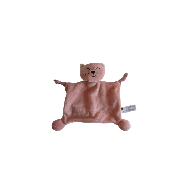Doudou chat plat 20 cm environ, rose motif pois au verso, 2 nouages. Etat : Comme neuf