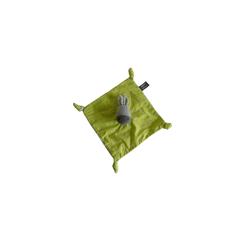 Doudou plat âne 24x24 cm environ, 4 nouages, vert motif étoiles et rayures gris blanc au verso. Etat : Comme neufRecipient :