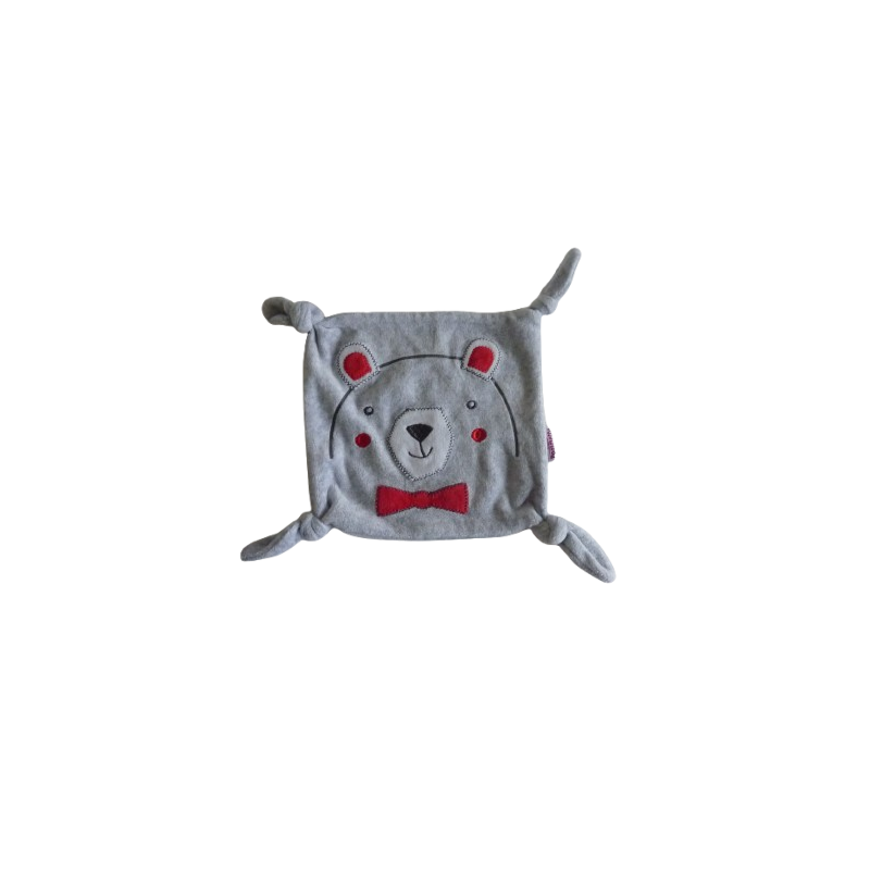 Doudou carré plat ours 19x19 cm environ, 4 nouages, tête d'ours gris rouge. Etat :Comme neufRecipient :