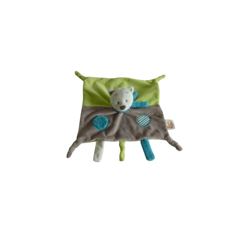 Doudou plat ours 25x25 cm environ, marron vert turquoise. Etat : Comme neufRecipient :