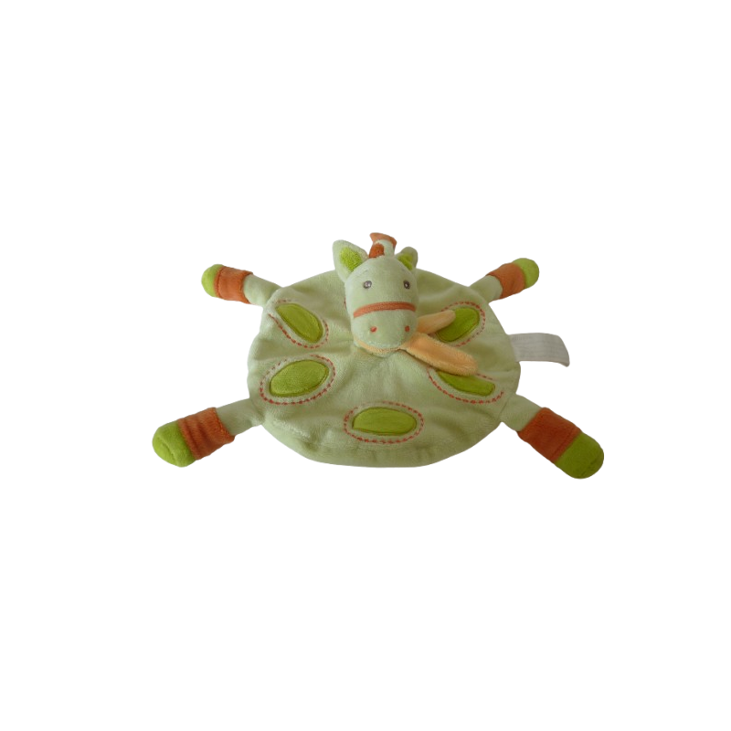 Doudou plat cheval 20 cm environ de large sans compter les pattes, vert orange. Etat : Parfait étatRecipient :