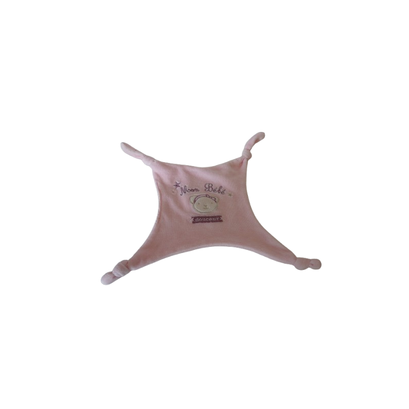 Doudou plat carré 16x16 cm environ, 4 nouages, rose Mon Bébé tête d'ours étoiles brodés. Doudou super doux. Etat : Comme neuf (étiquette marque coupée)Recipient :