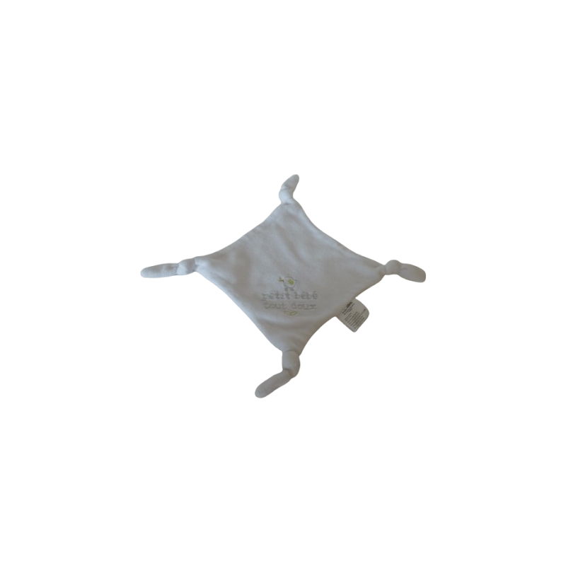 Doudou plat carré 16x16 cm environ, 4 nouages, blanc motifs oiseau Petit bébé tout doux brodé. Etat : Très bon étatRecipient :