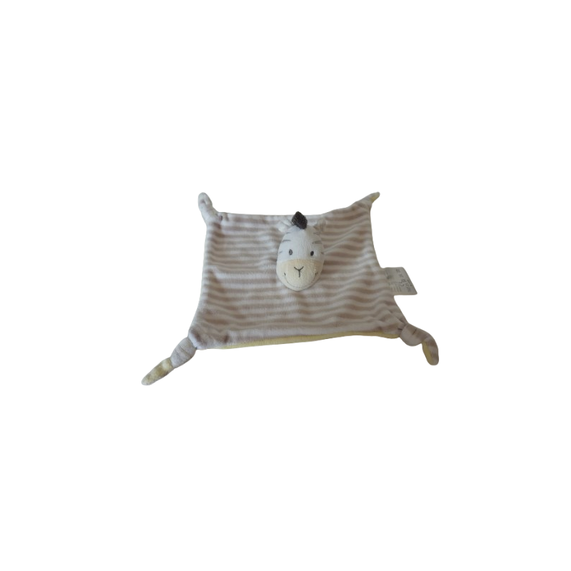 Doudou plat zèbre 4 nouages 21x21 cm environ, rayures blanc gris jaune au verso. Etat : Comme neufRecipient :