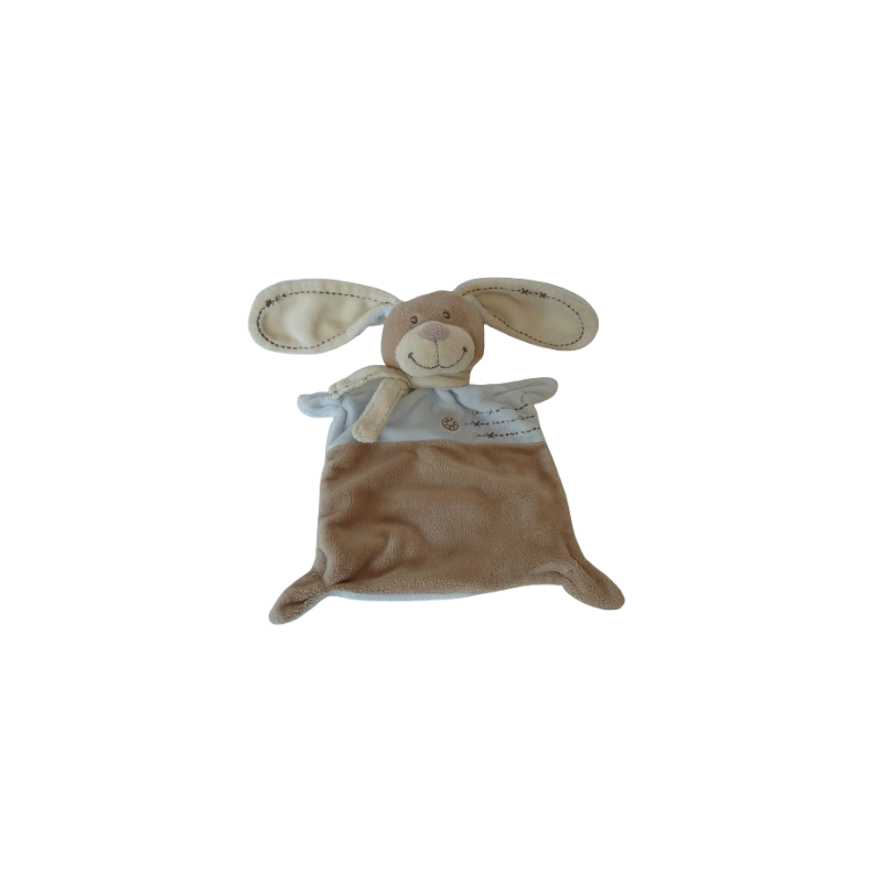 Doudou plat lapin 23 cm environ, marron bleu. Etat : Très bon état (étiquette marque coupée)Recipient :