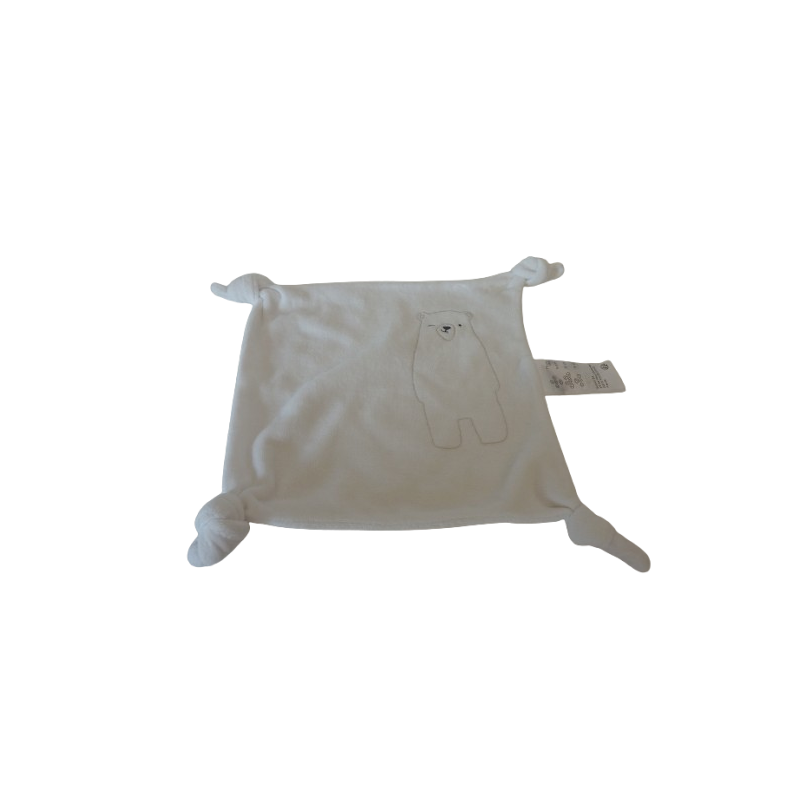 Doudou carre plat 4 nouage 25x25 cm environ, blanc motif ours. Etat: Comme neufRecipient :