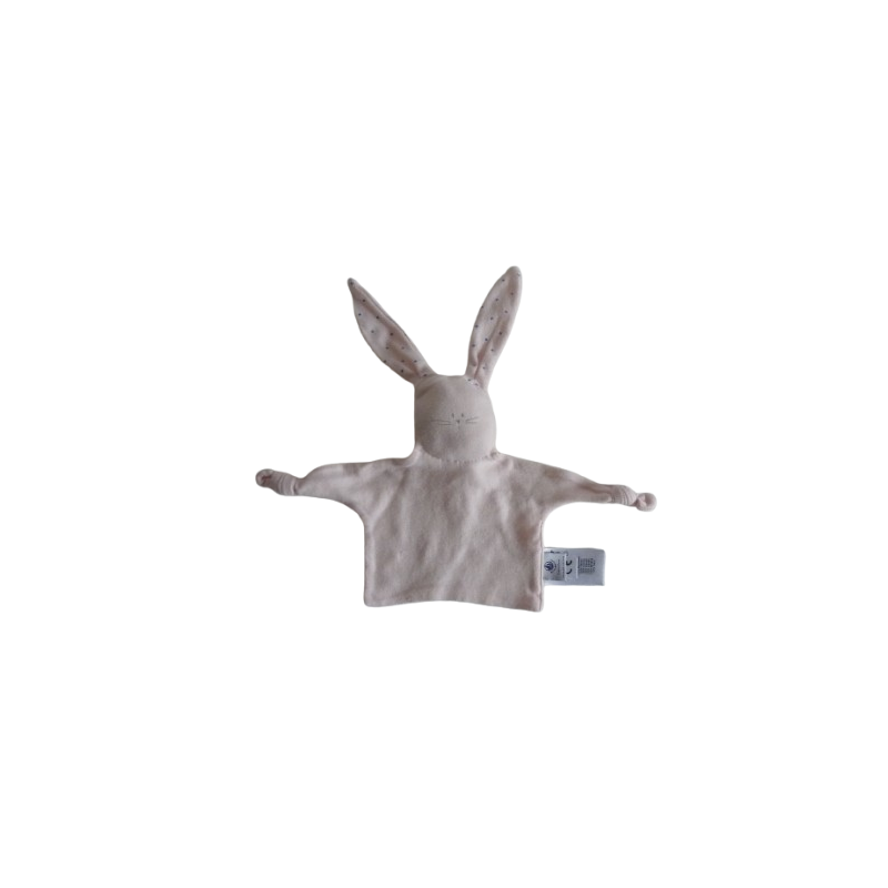 Doudou plat lapin 17 cm environ sans compter les oreilles, 2 nouages, rose. Etat : Comme neuf (étiquette marque coupée)Recipient :