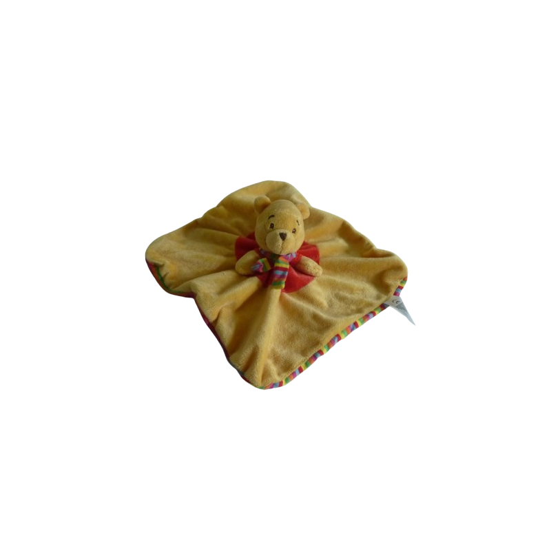 Doudou plat ours 24x24 cm environ, marron rayures multicolores au verso. Etat : Comme neuf