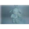 Doudou hochet ours déguisé en lapin 16 cm environ sans compter les oreilles, grelot, gris blanc. Etat : Comme neuf