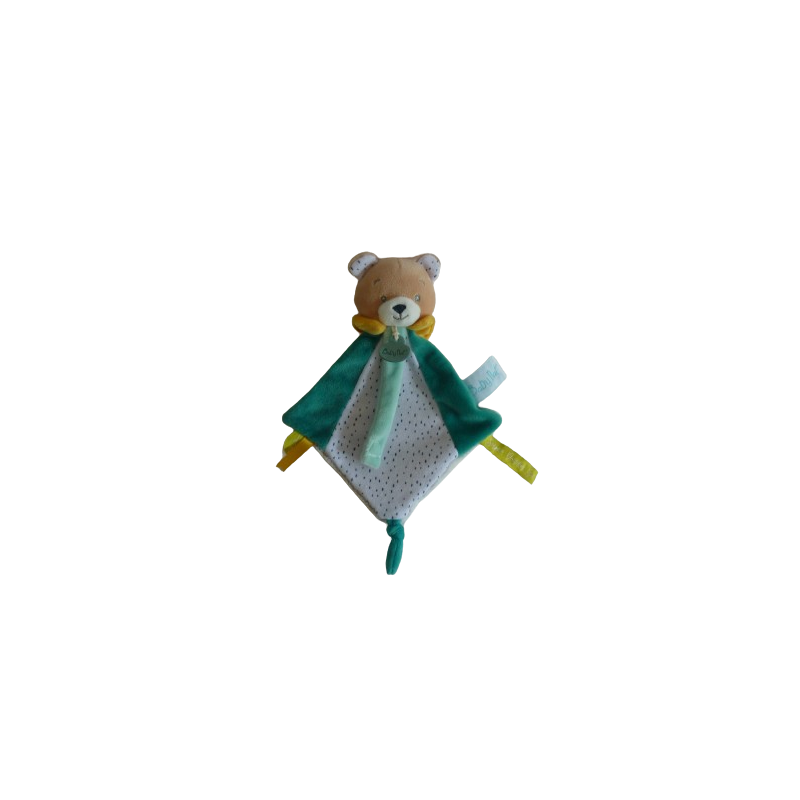 Doudou attache sucette ours27 cm environ, blanc vert écru motifs. Etat : Comme neuf