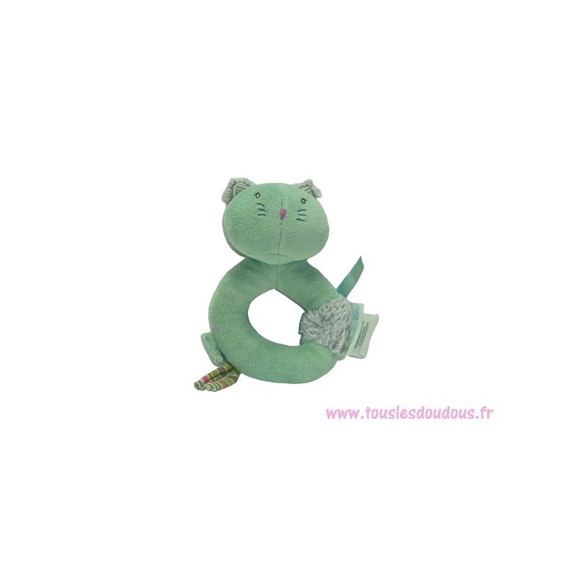 Description du doudou : Doudou hochet chat de 14 cm environ, grelot, Coloris : vert. Doudou super doux. Etat : Excellent état. SOS DOUDOU DIFFICILE A TROUVER.