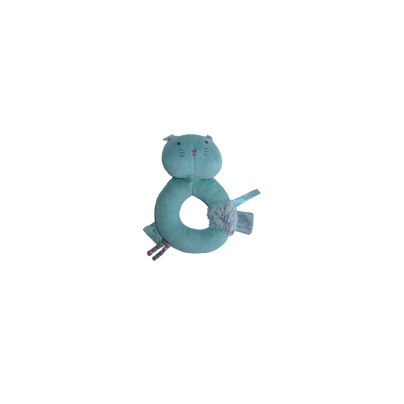 Doudou hochet chat 14 cm environ grelot, vert turquoise. Etat : Comme neuf (étiquette d'informations coupée). DOUDOU DIFFICILE A TROUVER.Destinataire :