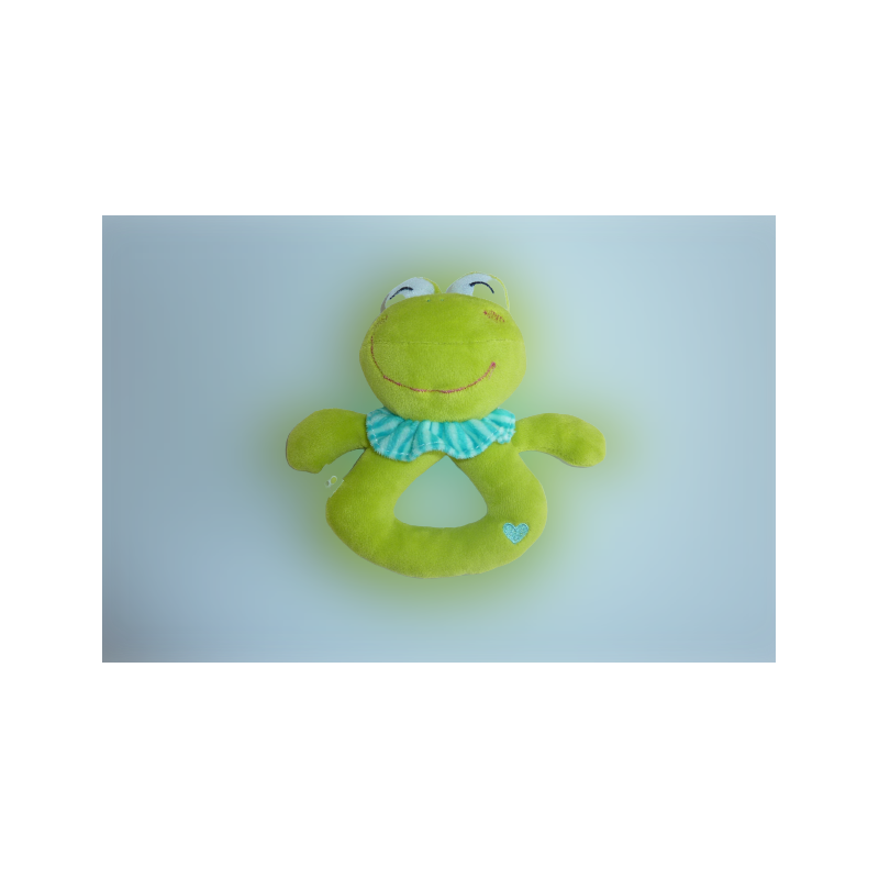 Doudou hochet grenouille grelot, vert 16 cm environ. Etat : Comme neuf (étiquette de la marque coupée) DOUDOU DIFFICILE A TROUVER