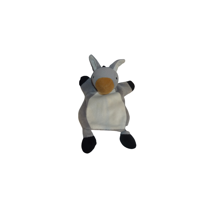 Doudou marionnette âne 30 cm environ, grelot, bruissage dans les oreilles. Etat : Très bon état. DOUDOU DIFFICILE A TROUVER.